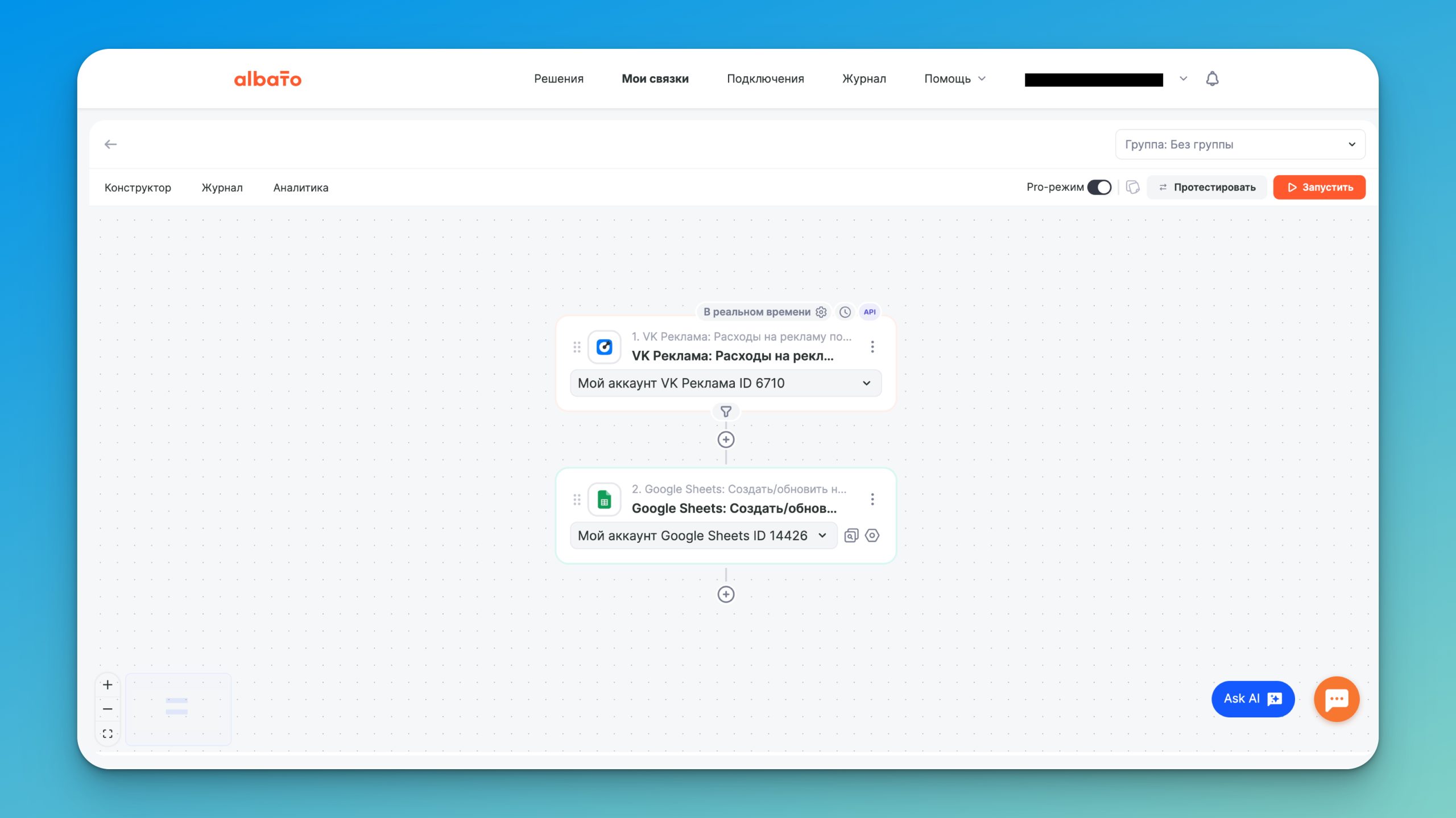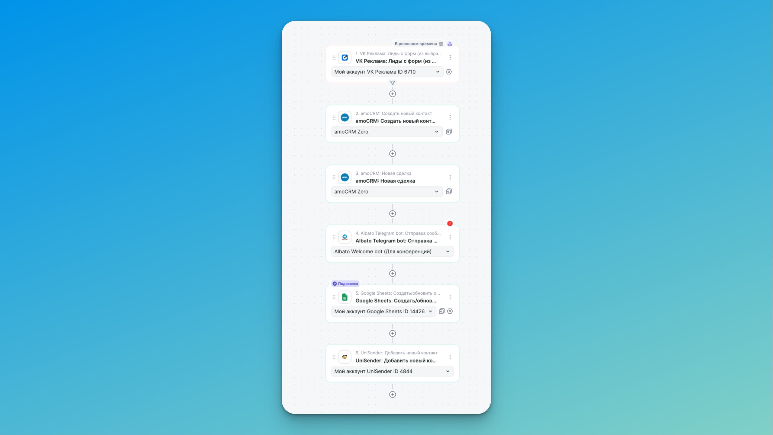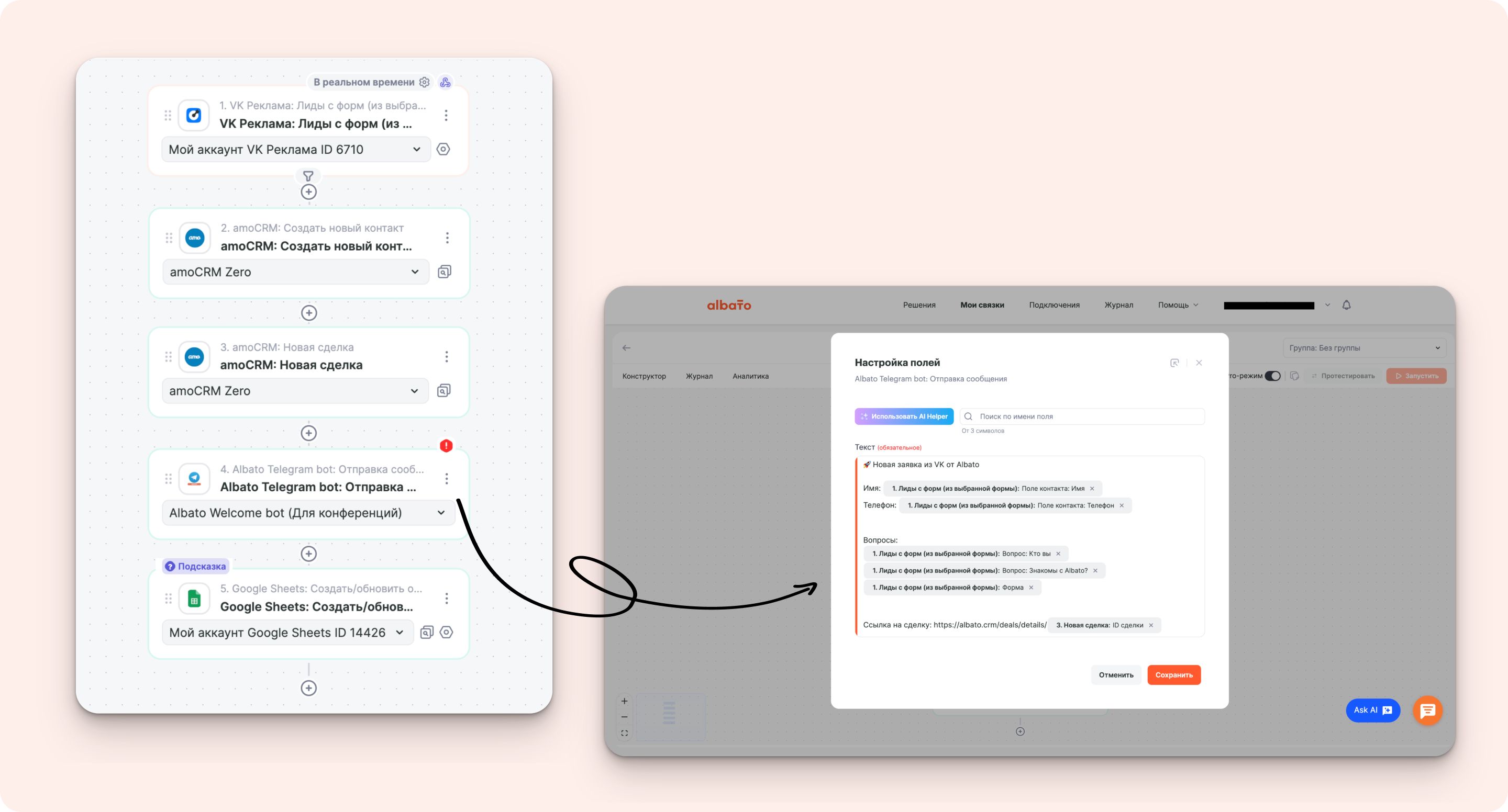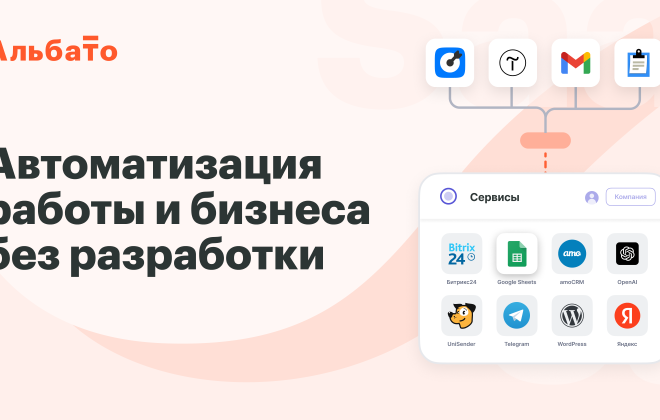 Альбато позволяет настраивать интеграции из уже готовых блоков. Вы связываете сервисы, указываете, что должно в них происходить, и какие данные и куда нужно передавать. А остальное делает платформа.