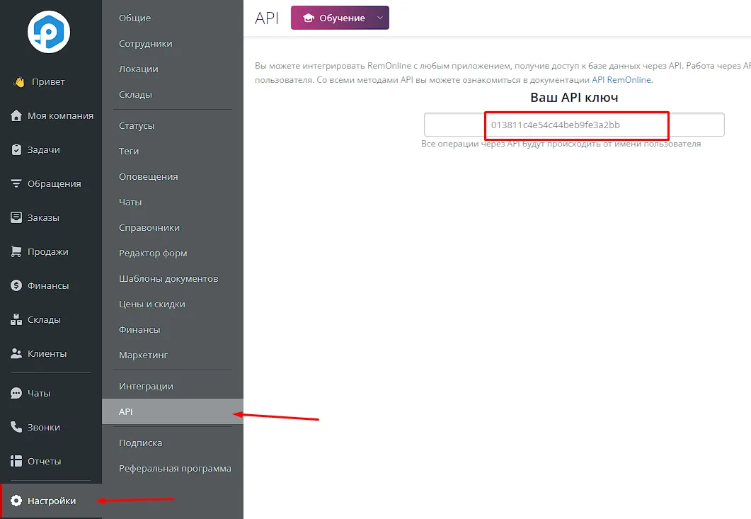 Для подключения нам необходимо найти API ключ в настройках учетной записи РемОнлайн.