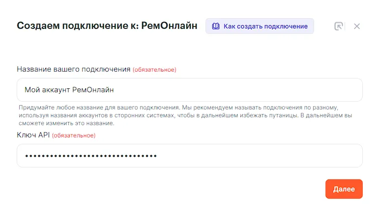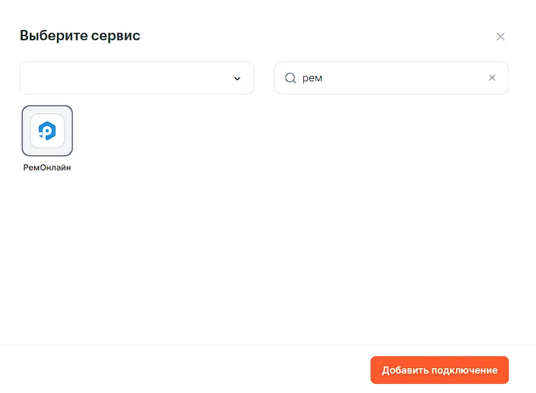 Копируем ключ и переходим в личный кабинет Albato, Подключения —> Добавить подключение. В открывшейся форме выбираем РемОнлайн.