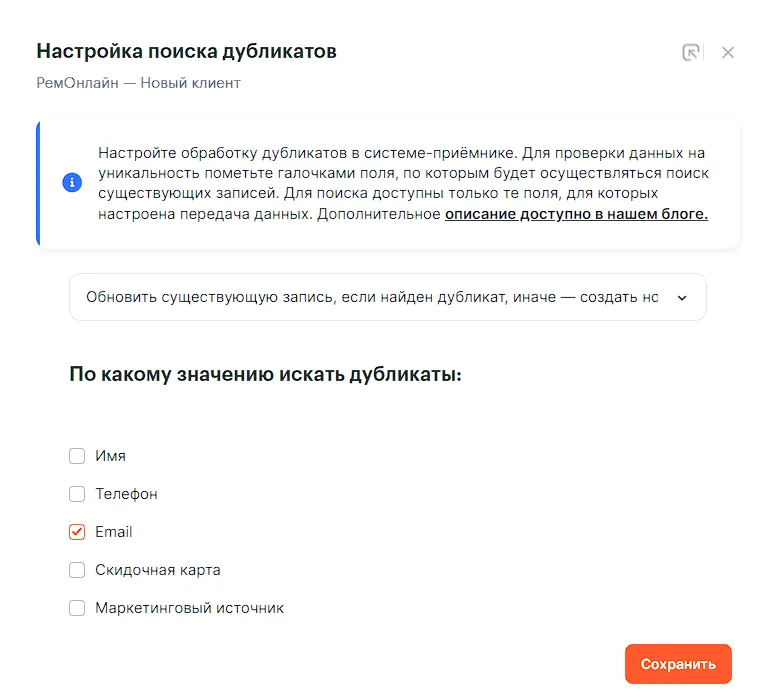 Мы рекомендуем выбрать «Обновить существующую запись, если найден дубликат, иначе создать новую запись», а в качестве контрольного поля использовать «Email»: