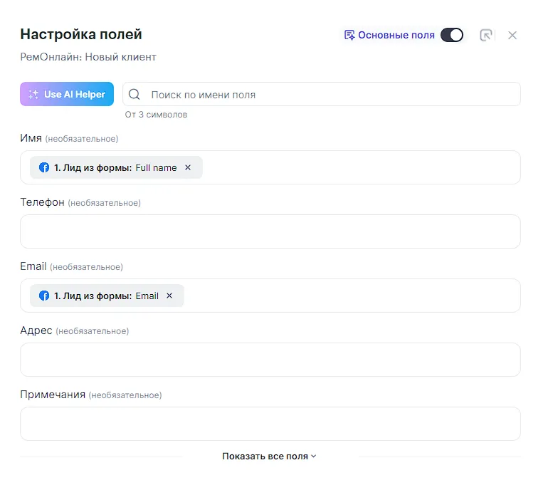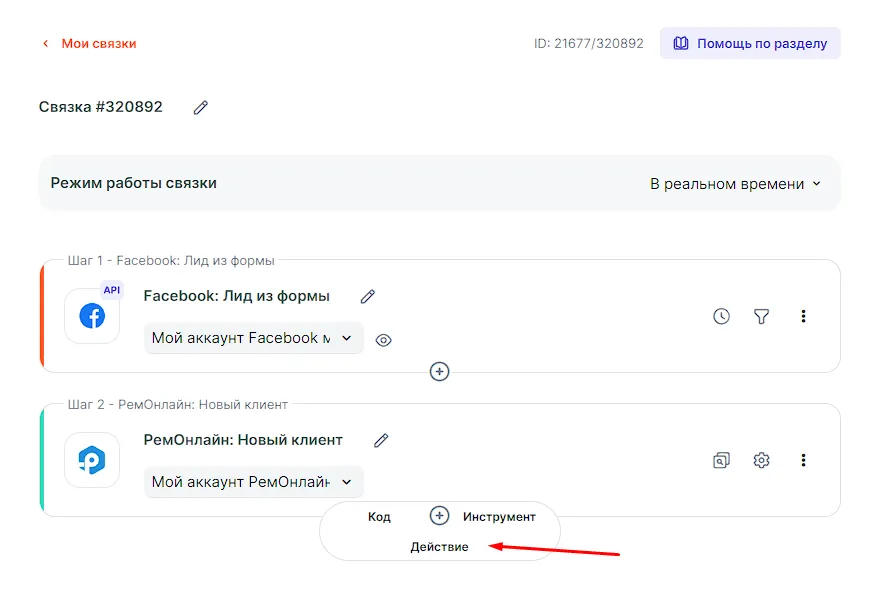 Теперь можно создать связку, которая будет передавать данные из лид-формы Facebook в РемОнлайн с созданием в последнем Клиента и Заказа к нему.