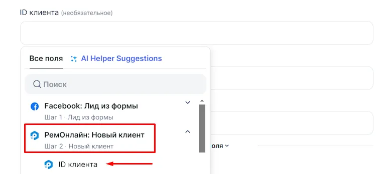 Внимание! ID клиента берем из выпадающего списка от РемОнлайн с соответствующим названием поля: