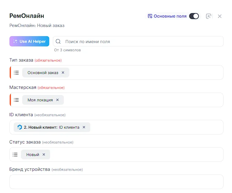 Для полей Мастерская, Тип заказа и Статус выбираем значения из выпадающего списка, содержащиеся в блоке «Из справочника». Эти значения подтягиваются непосредственно из вашего аккаунта РемОнлайн: