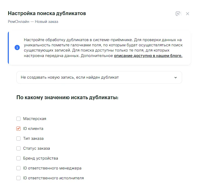 Если нам нужен только один заказ к клиенту, то выбираем «Не создавать новую запись, если найден дубликат», при этом ставим галочку для ID клиента.