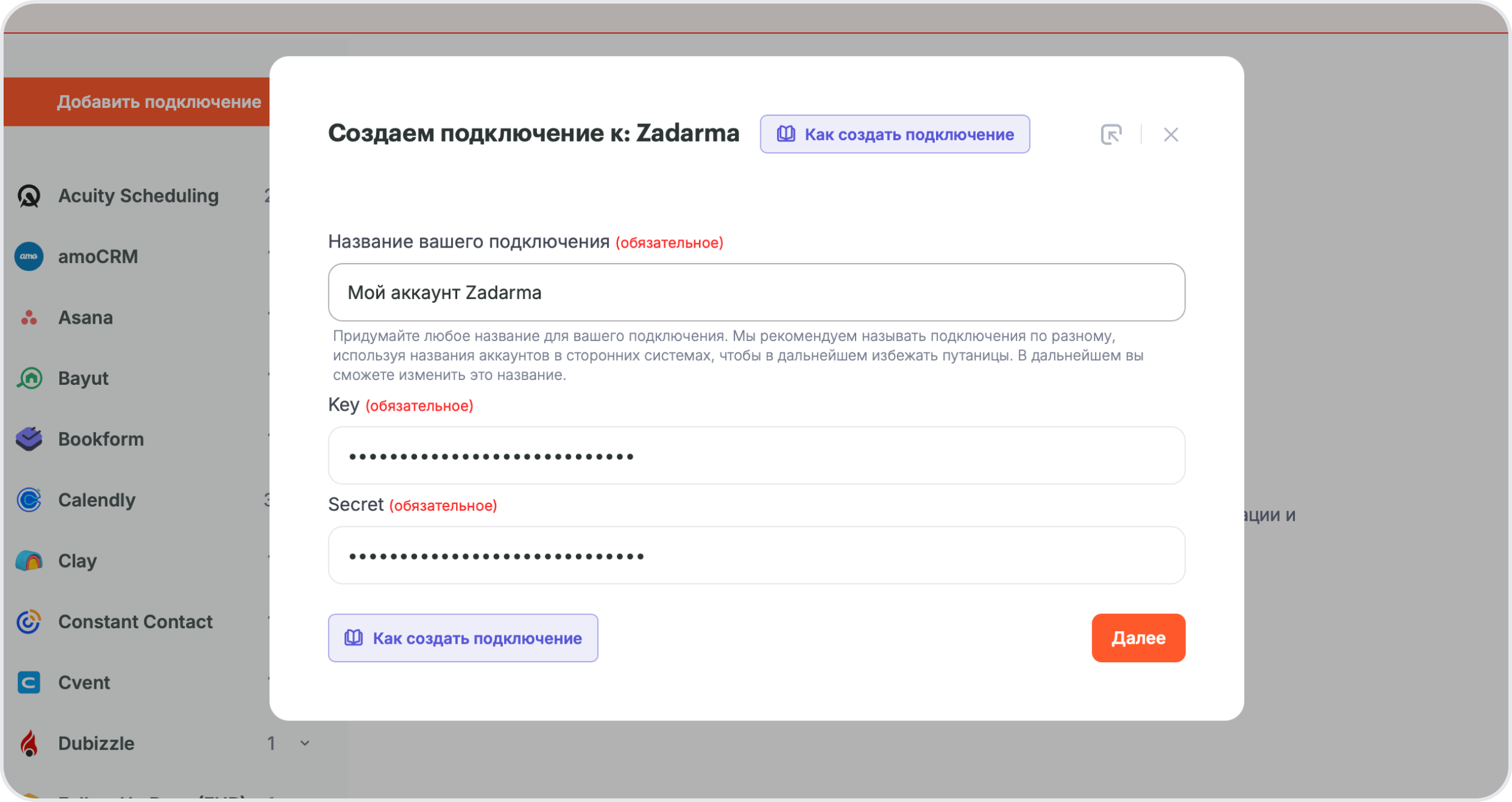 На новом экране вам необходимо выбрать название для подключения и заполнить два поля данными из самого сервиса Zadarma.