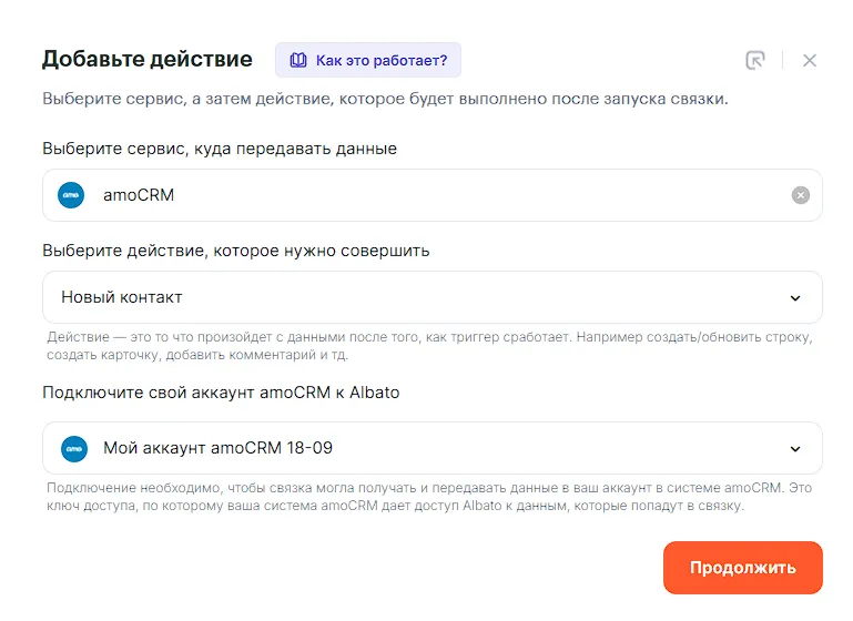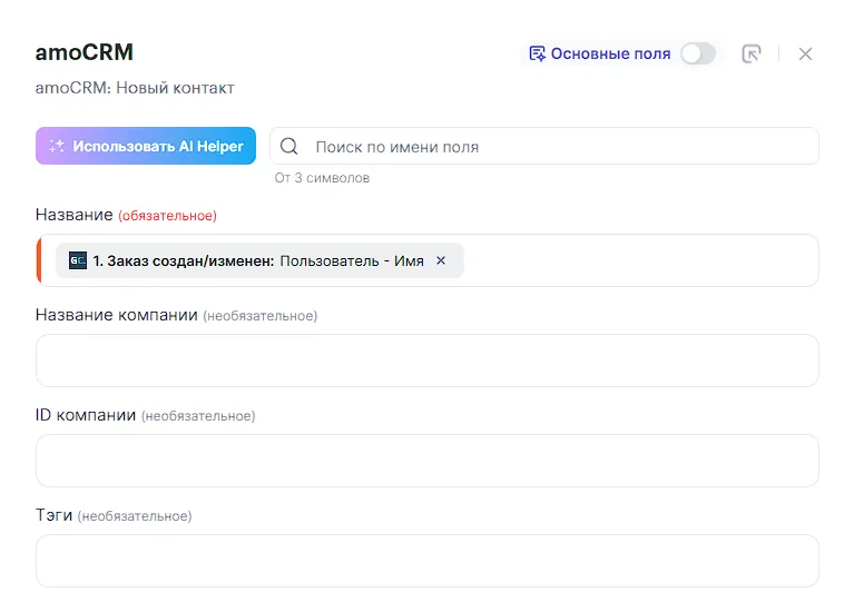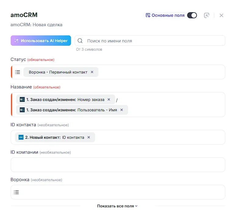 – ID контакта обязательно заполняем параметром из выпадающего списка от amoCRM