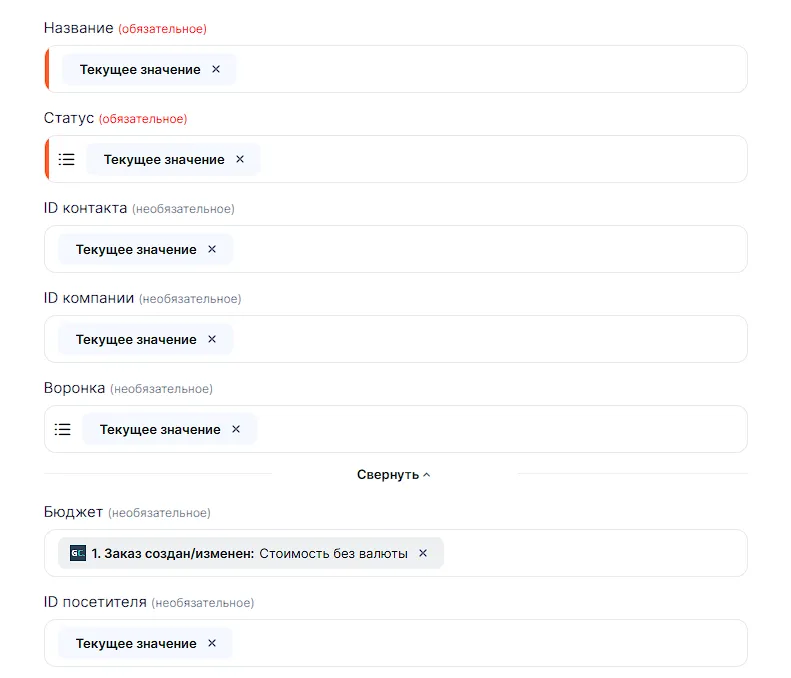 Нажимаем Сохранить. Можем выбрать поля для обновления. У нас будет поле Бюджет заполняться актуальными данным. Вместо макроса Текущее значение выберем парамерт Стоимость из выпадающего списка от GetCourse.