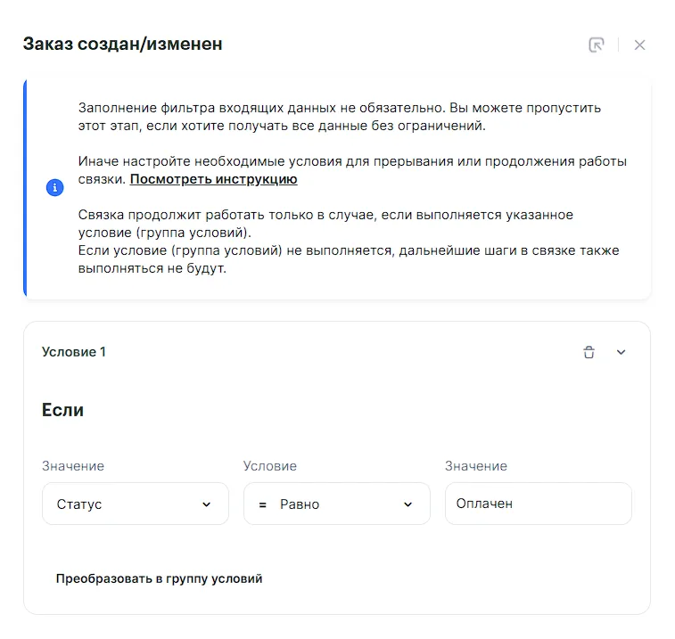 Нажимаем “Добавить условие”, из выпадающего списка выбираем параметр Статус, в следующем выпадающем списке выбираем Равно и в последнее поле вписываем Оплачен. Сохраняем настройки фильтра.