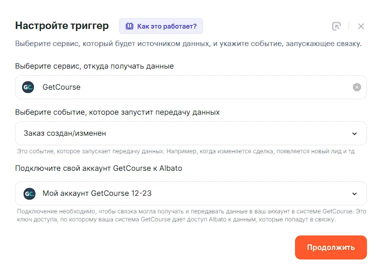 Для передачи данных из GetCourse нужно прописать вебхуки из Альбато в GetCourse. Для этого воспользуйтесь инструкцией по подключению GetCourse к Альбато