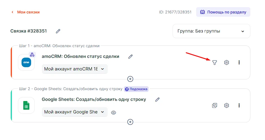 Фильтр находится в настройке первого шага любой связки. Получить доступ к нему можно на экране «Конструктор связки»: