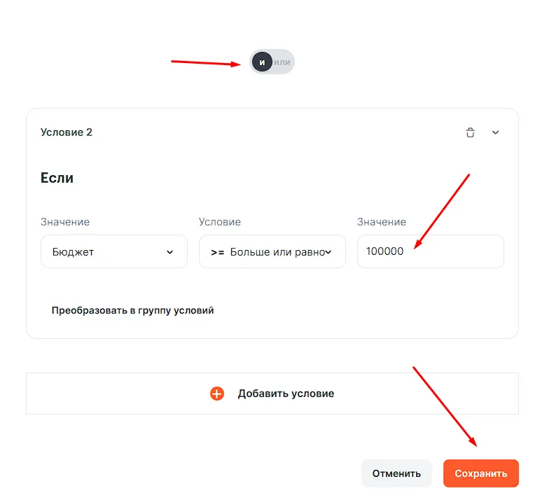 Теперь связка будет срабатывать только для сделок со статусом «Продажа состоялась» ИЛИ «Клиент ушел» И бюджетом сделки БОЛЬШЕ ИЛИ РАВНО 100 000 рублей.