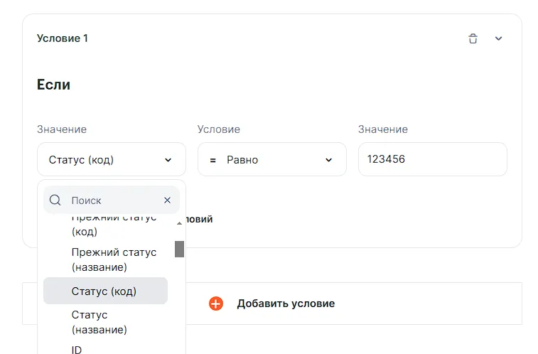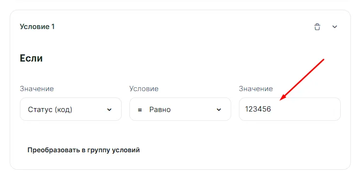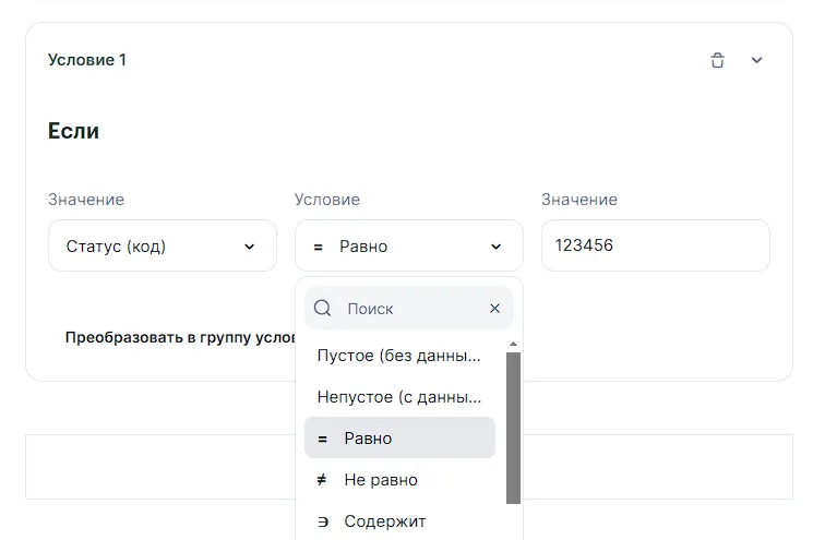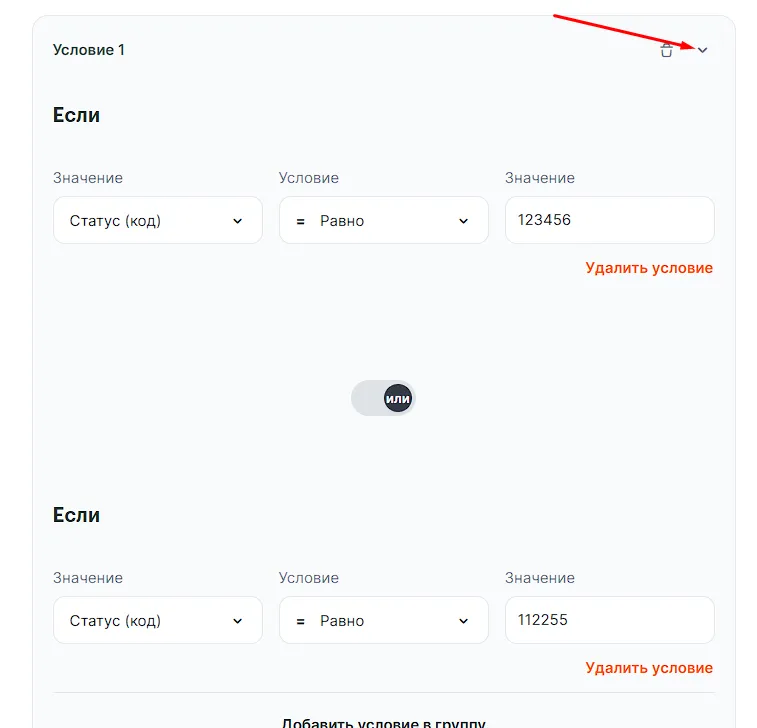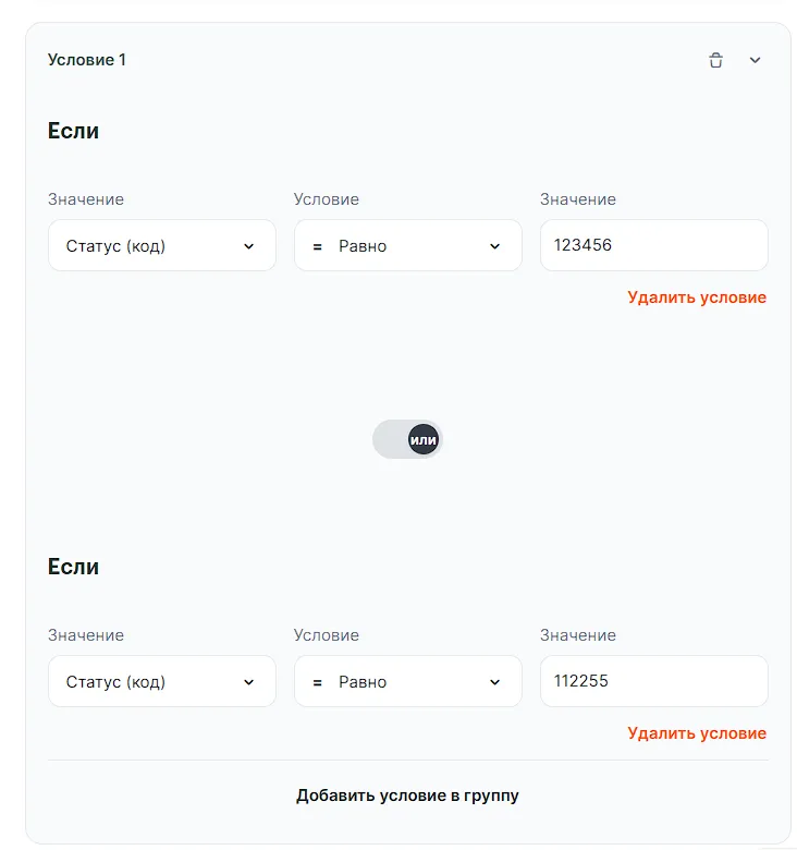 Например, вы хотите, чтобы связка срабатывала при статусах сделки «Продажа состоялась»/123456 или «Клиент ушел»/112255. В этом случае можно преобразовать условие в группу условий: