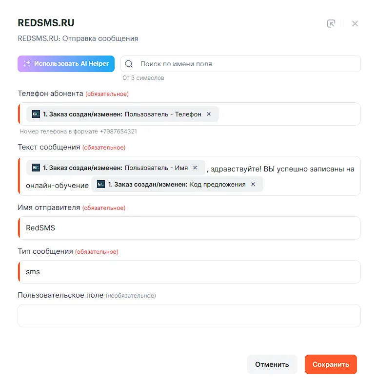 Готово! Мы создали связку, которая будет отправлять смс пользователям, оплатившим курс. Не забудьте ее запустить.