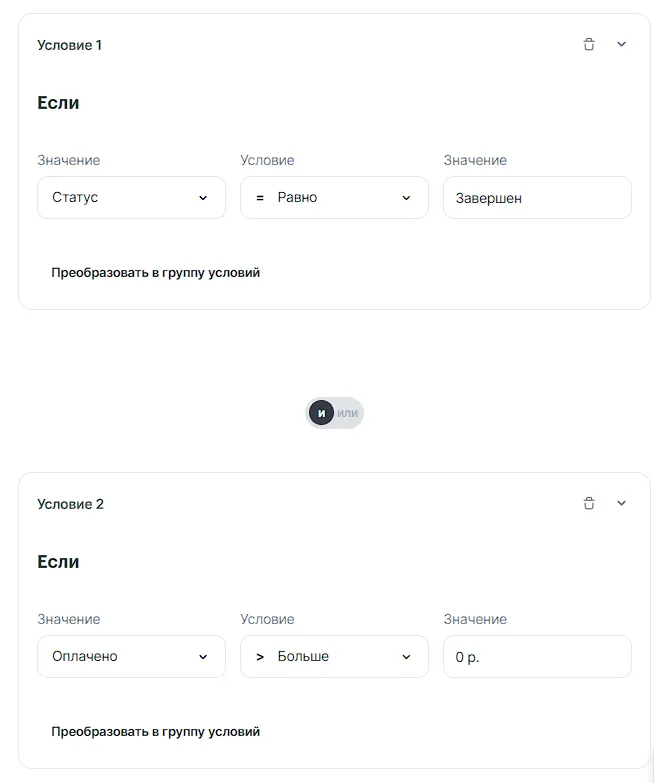Как работает фильтр: наш фильтр будет состоять из двух условий: проверка по статусу заказа и по признаку оплаты. Будем отслеживать все заказы на статусе Завершен с оплатой больше, чем 0 р. Как выглядят настройки фильтра с данными условиями можно увидеть на скринах ниже.