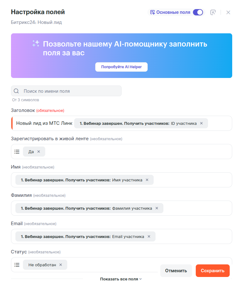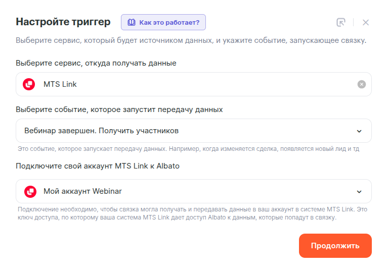 В этой инструкции мы рассмотрим, возможности интеграций с MTS Link через Albato – как получать данные участников после окончания вебинара и передать их в Вашу CRM.