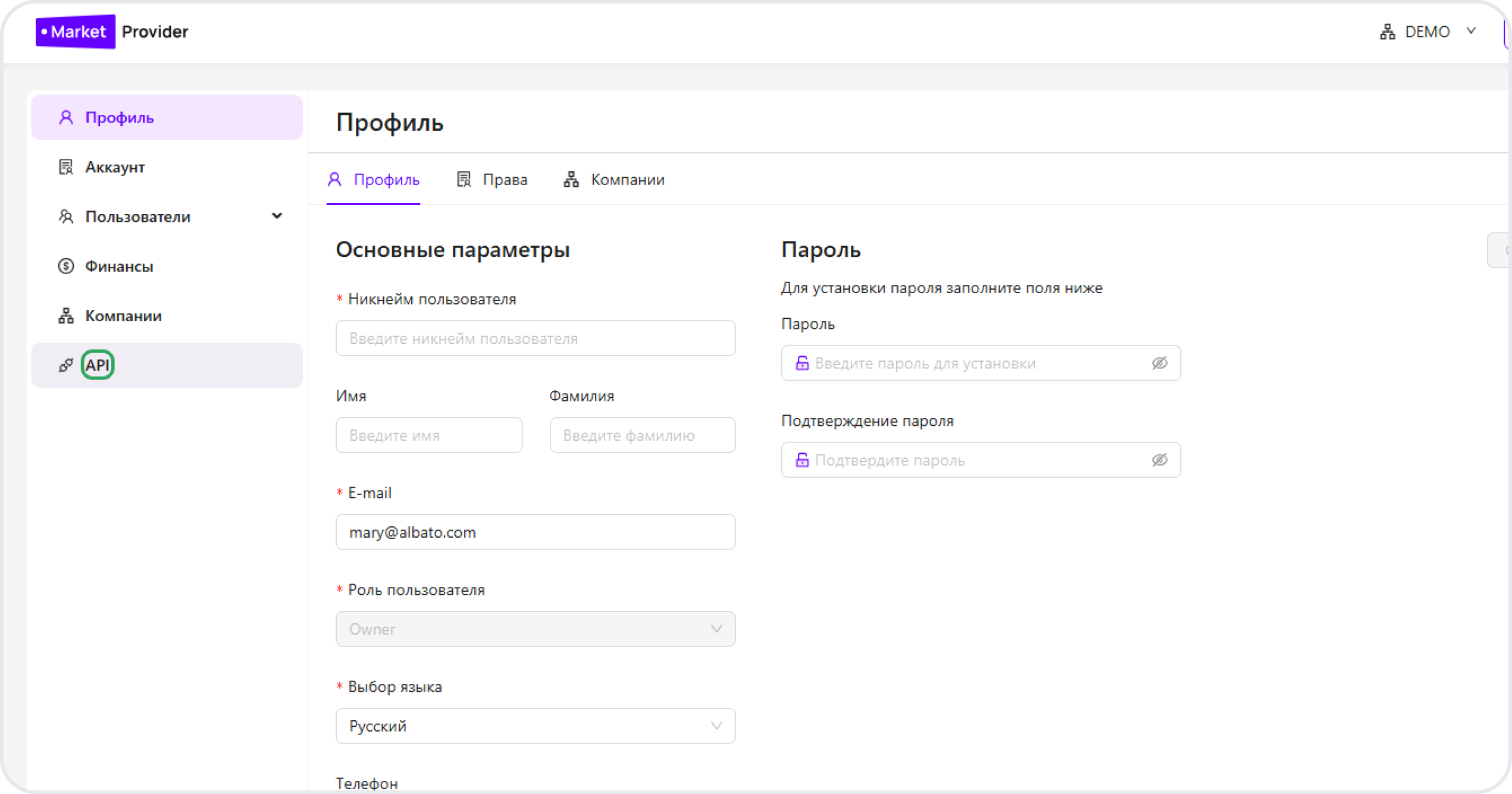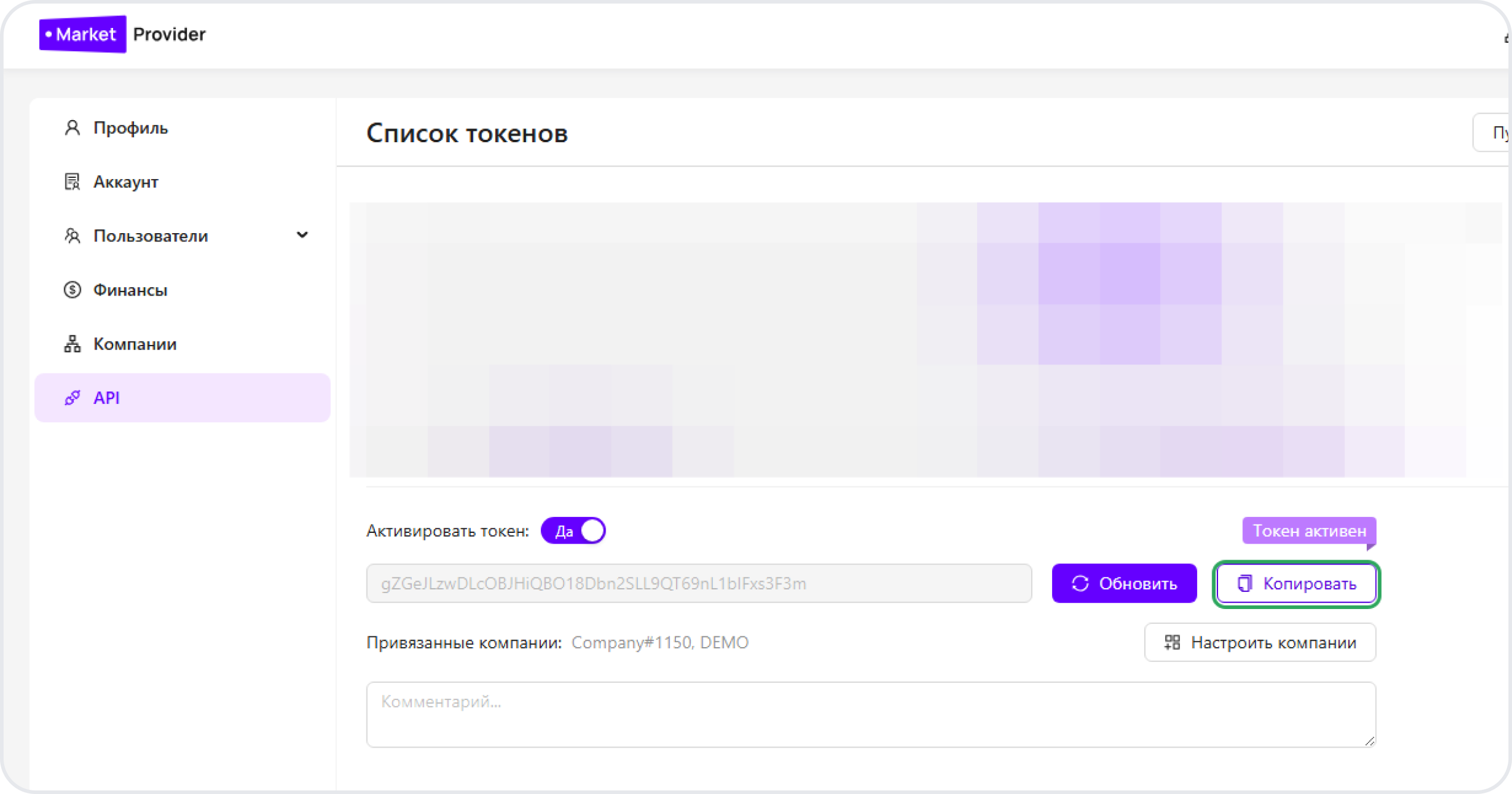 • Чтобы  указать Токен доступа, перейдите в личный кабинет Market Provider. Откройте раздел API.