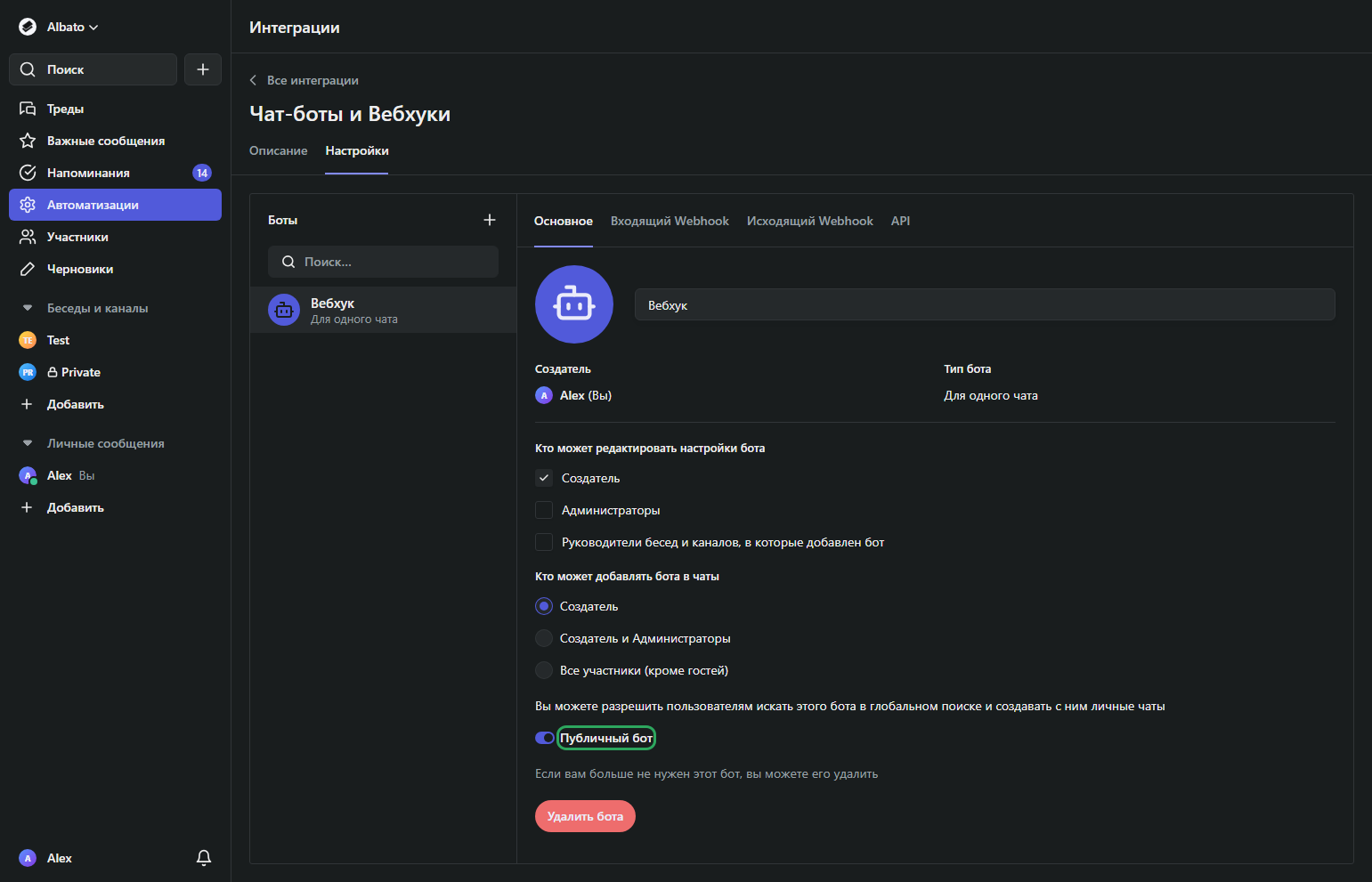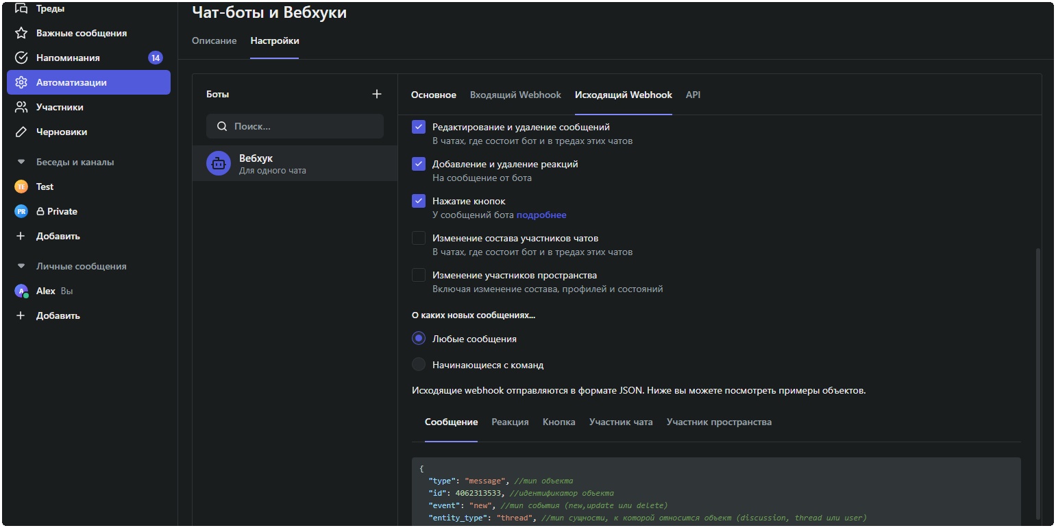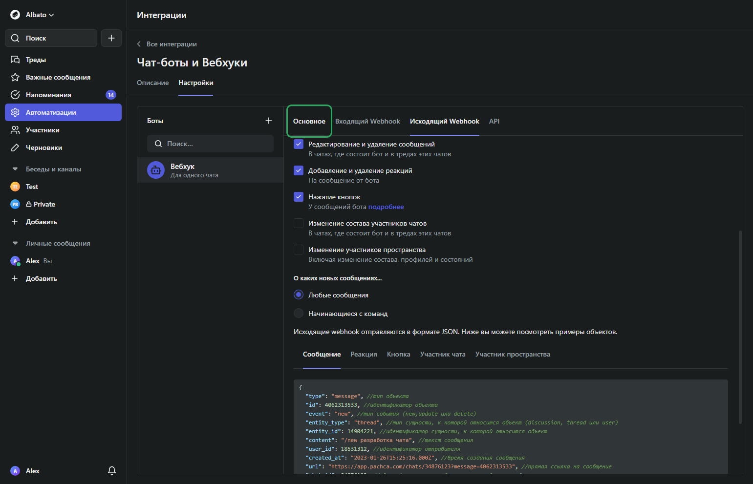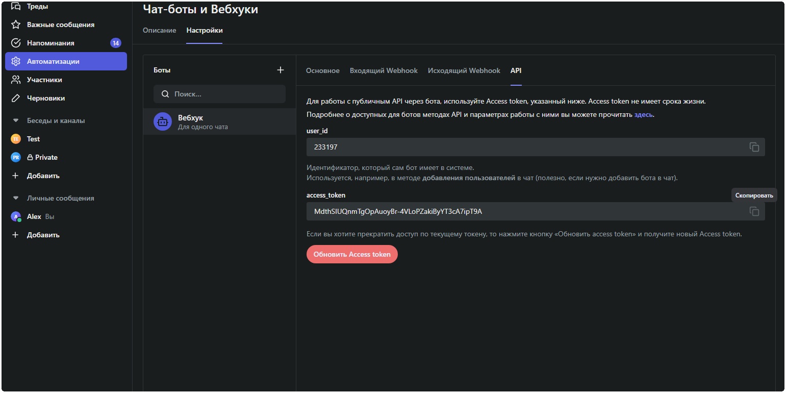 • Выберите «Чат-боты и Вебхуки» и откройте нужного бота.