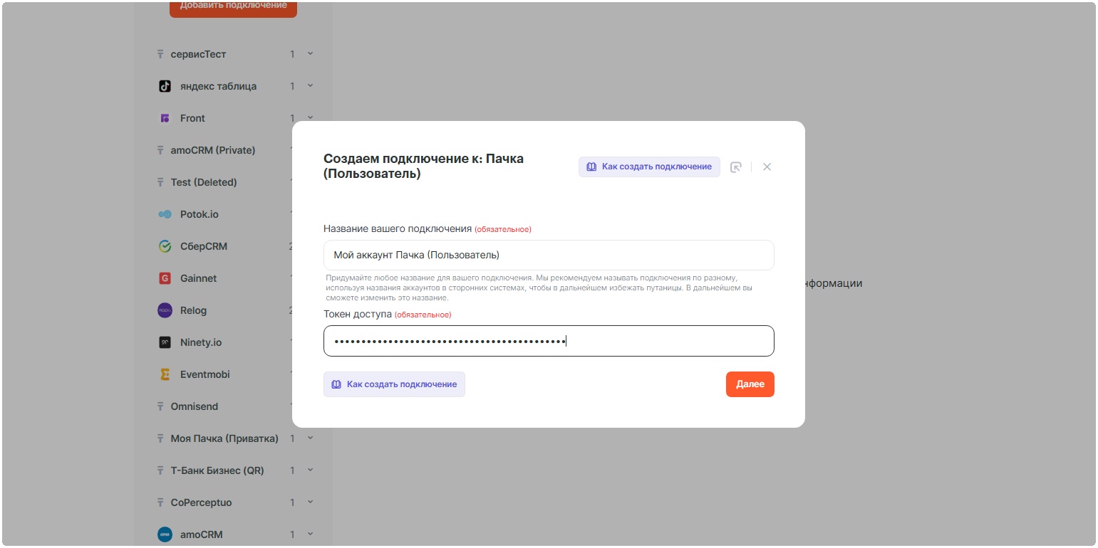• Придумайте название вашему подключению и нажмите Далее. Вставьте скопированный токен в поле «Токен доступа» и нажмите «Далее».