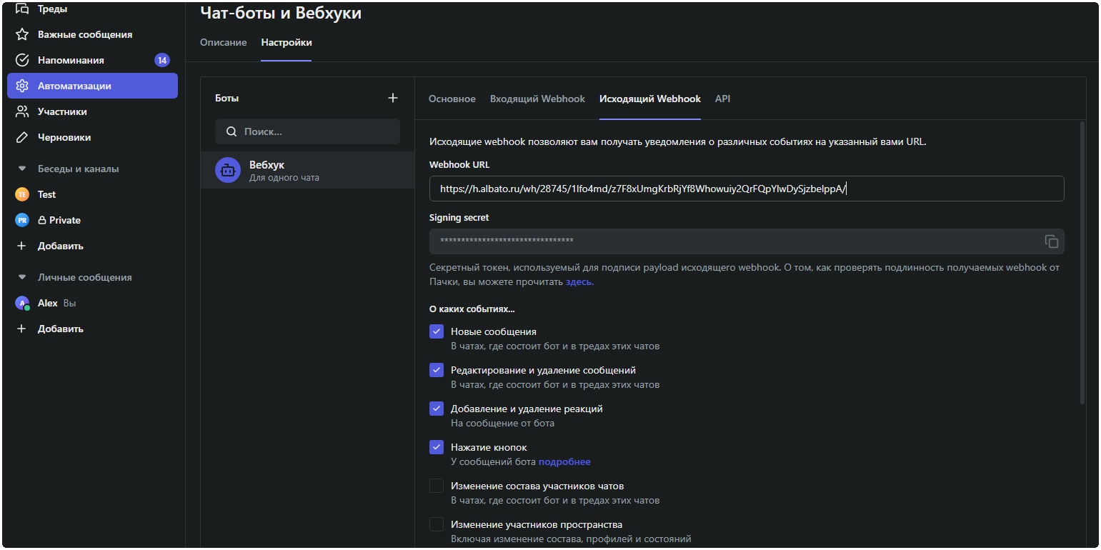 • Перейдите в личный кабинет Пачки → вкладка Автоматизация → раздел Чат боты и Вебхуки. Откройте настройки бота, перейдите на вкладку «Исходящий Webhook» и вставьте скопированный URL в поле «Webhook URL». Включите основные событие.