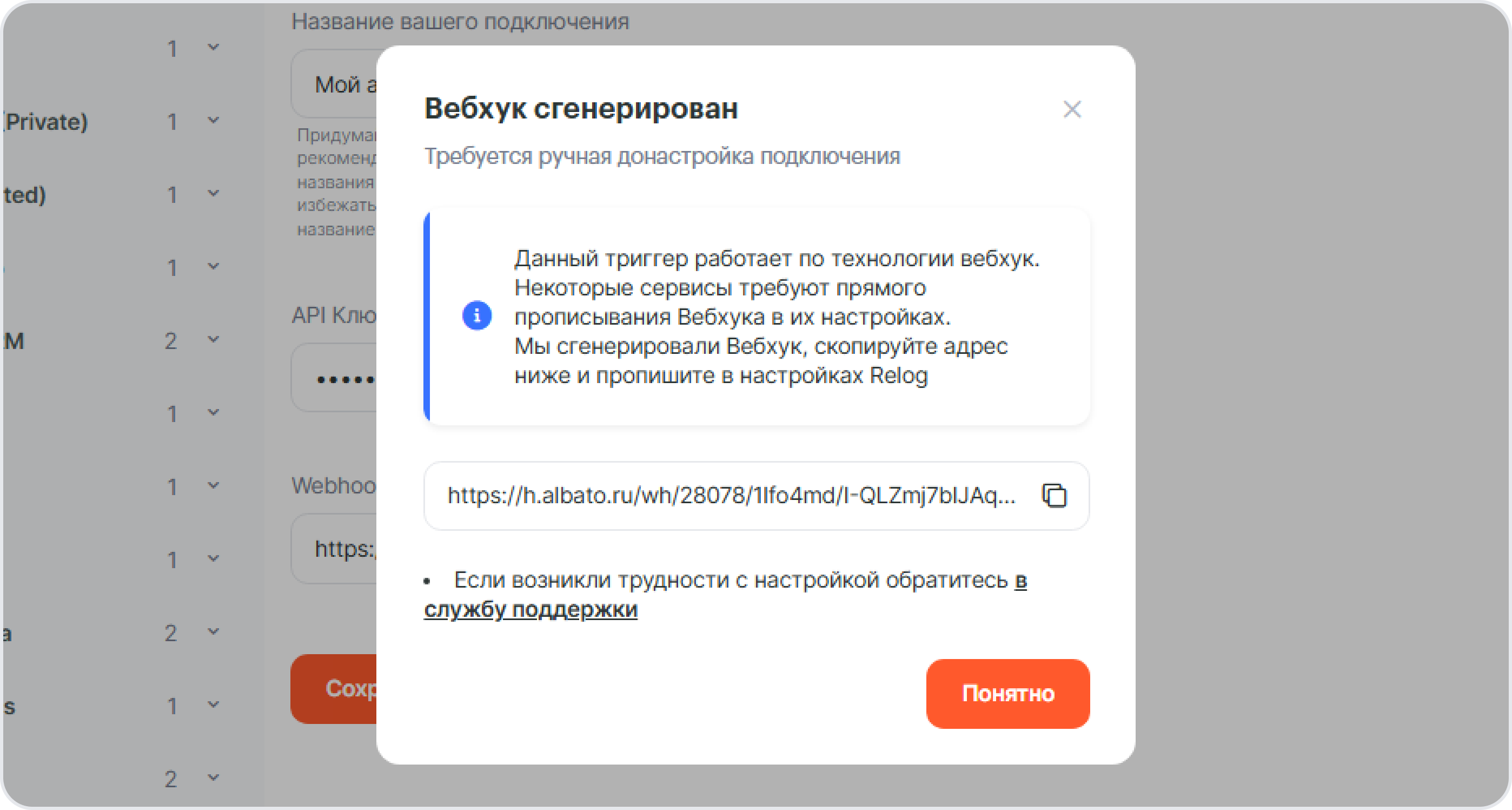 - Скопируйте Вебхук — он понадобится для настройки вебхука в Relog.