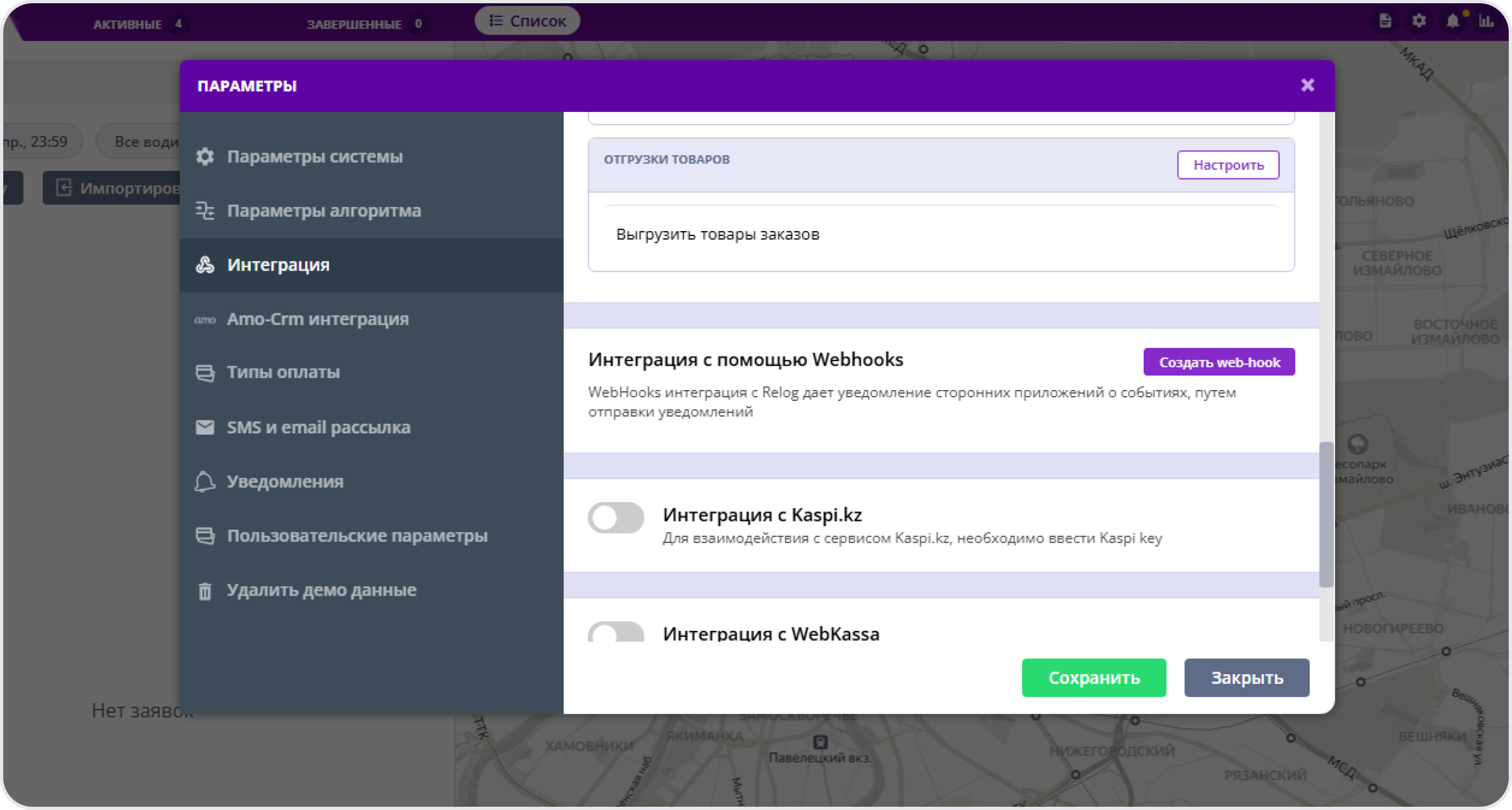 Вернитесь в сервис Relog. Откройте раздел Интеграция с помощью Webhooks.