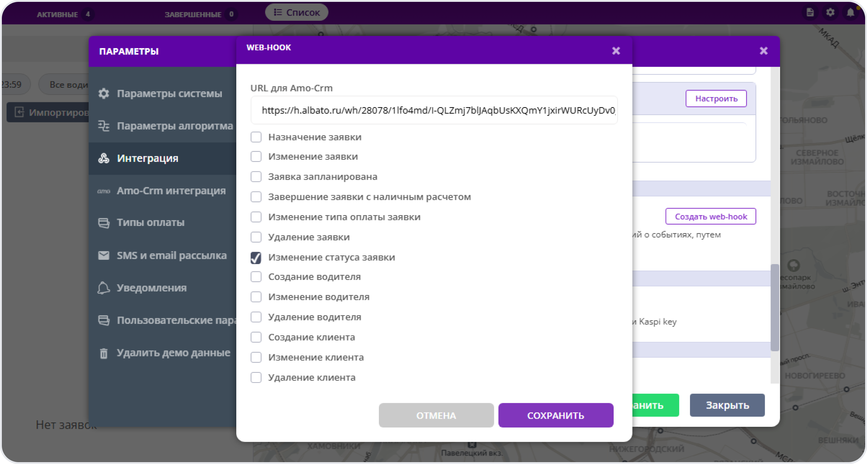 Нажмите Создать web-hook. В поле URL укажите Вебхук Альбато. В разделе Событие выберите Изменение статуса заявки.