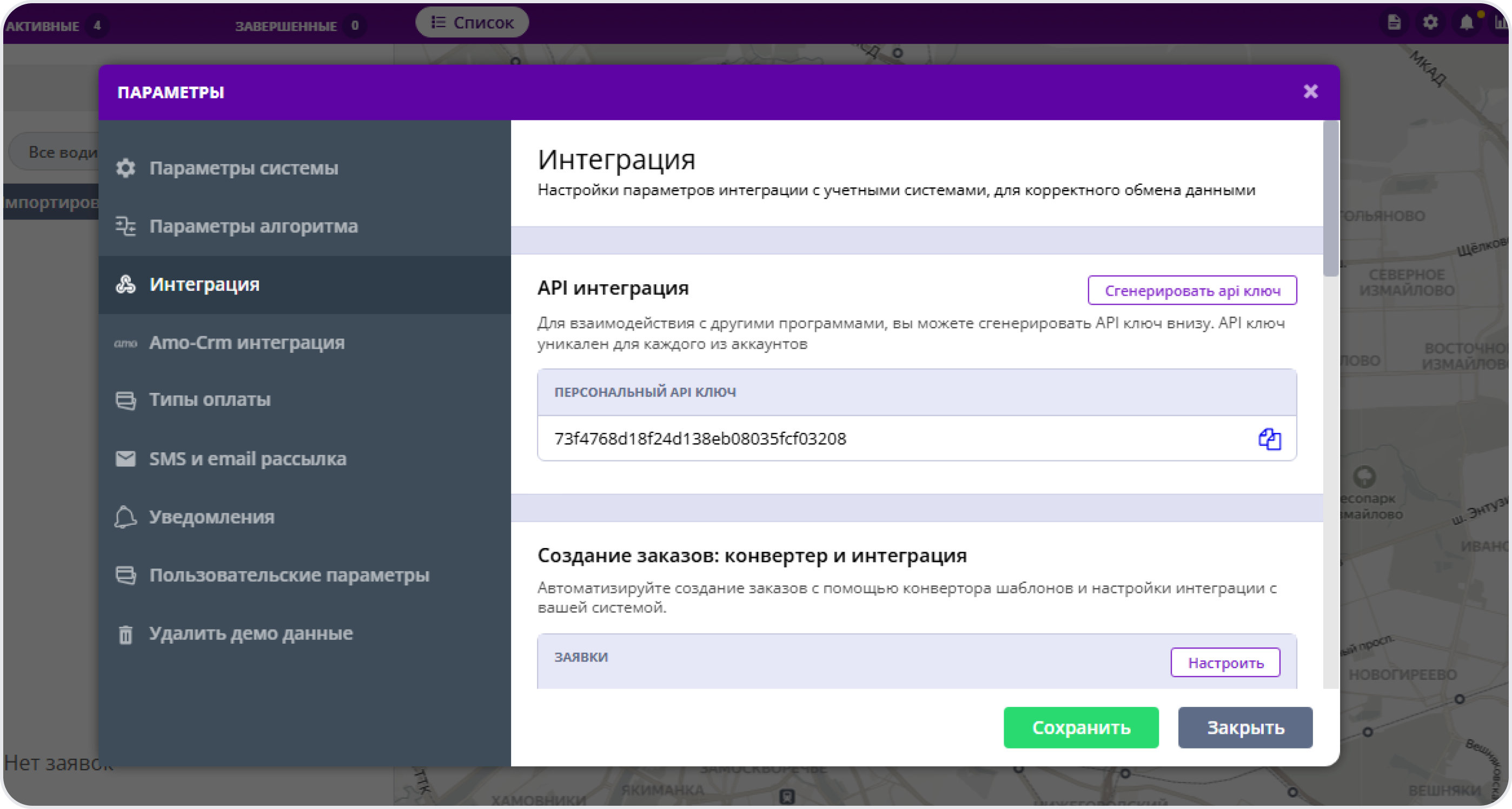 - Выберите раздел Интеграция и скопируйте ваш ключ.
