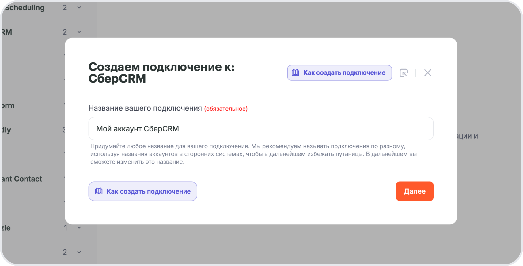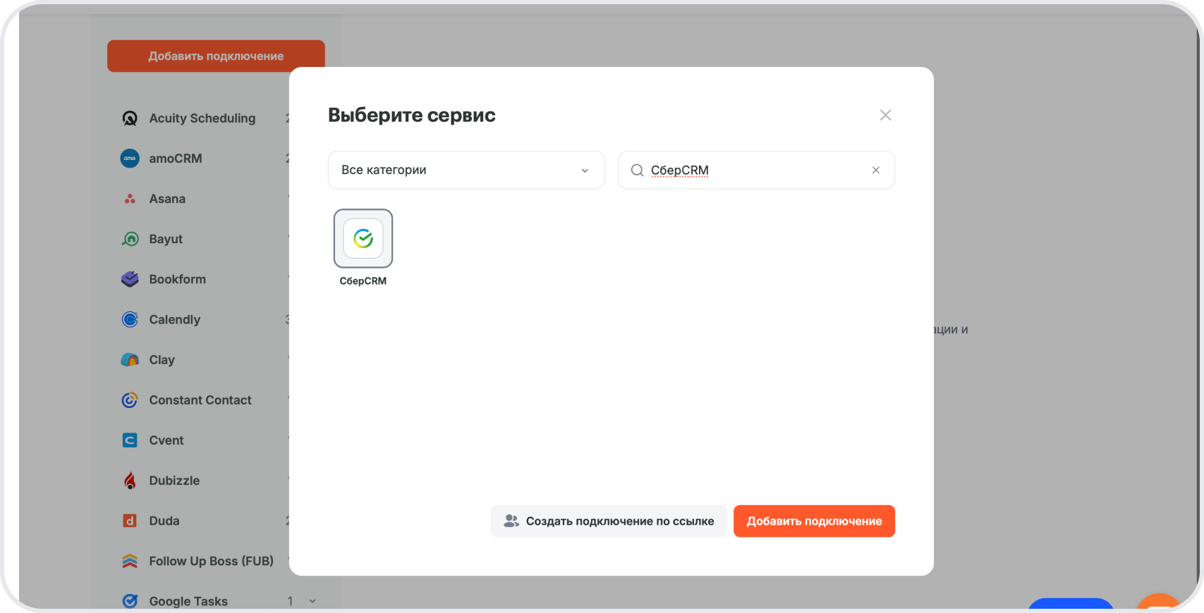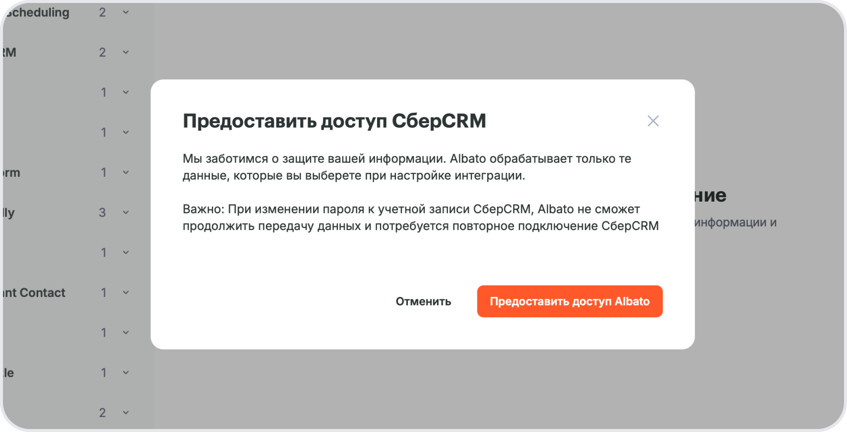 Чтобы настроить интеграцию с Sber CRM, подключите сервис к Альбато.