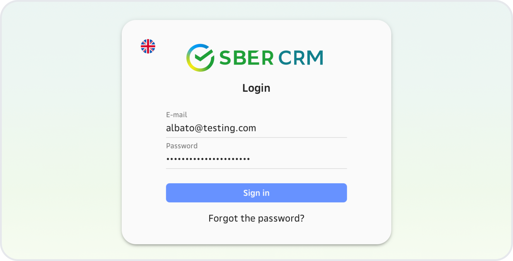 Далее для настройки вам понадобятся данные вашей учётной записи — логин и пароль, используемые для входа в Sber CRM.