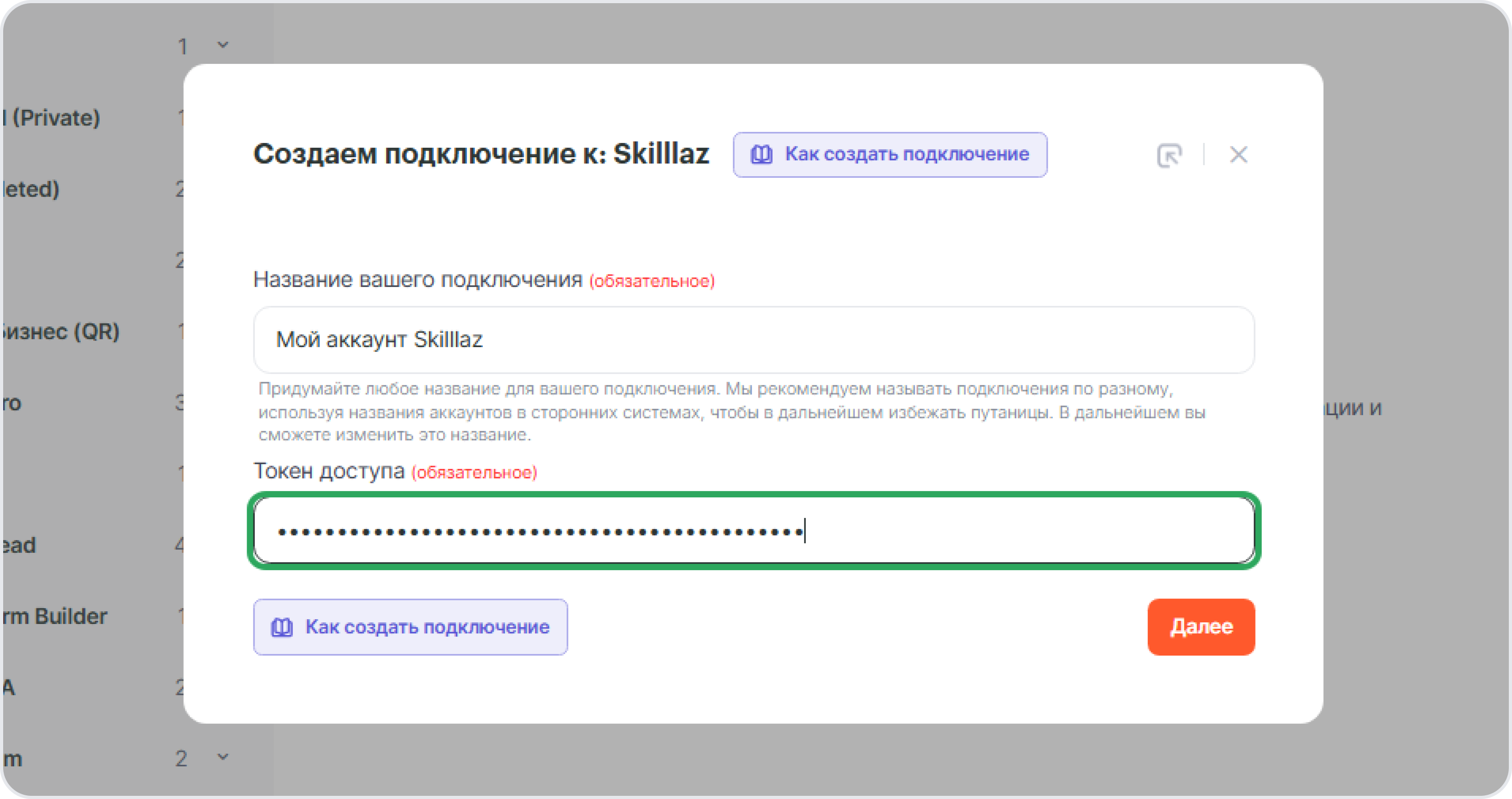 - Укажите токен доступа, полученный в Skillaz. Для этого запросите его в службе поддержки через форму обратной связи.