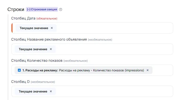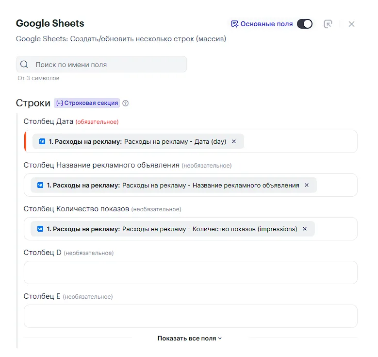 На следующем окне настроек сопоставь поля Google Sheets и ВКонтакте и выбери параметры, которые хочешь передавать.