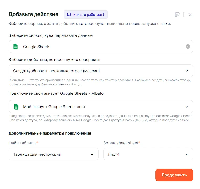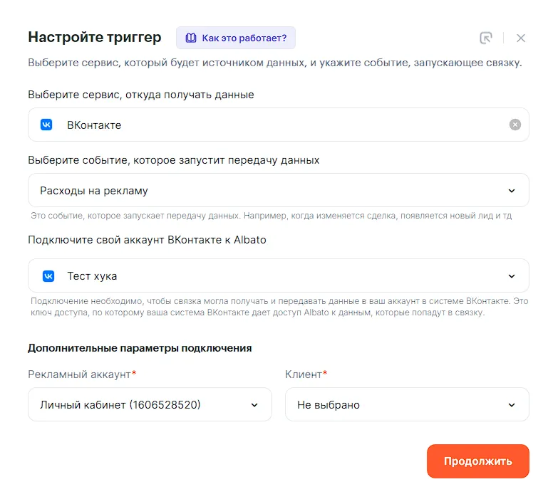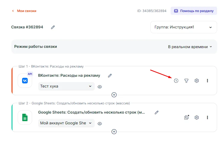 Для примера создадим связку, которая будет передавать данные из рекламного кабинета ВКонтакте в Google Sheets. По аналогии можно выгружать данные в любой сервис. Например, в Google BigQuery, Яндекс.Метрику или Telegram.
