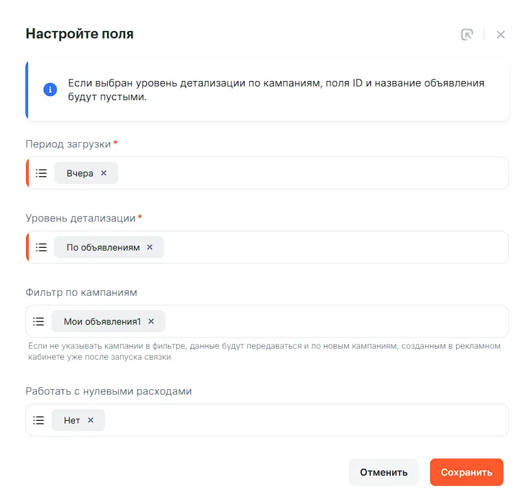 - Уровень детализации — по кампаниям или объявлениям.