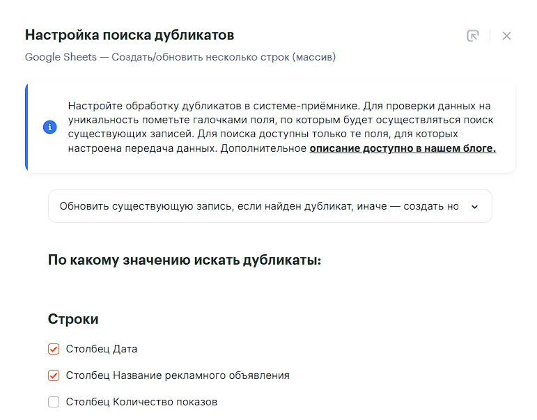 Например, если ты хочешь обновлять записи в таблице, выбери вариант «Обновить существующую запись, если найден дубликат, иначе — создать новую запись». А потом укажи столбцы, по которым Albato будет искать дубликаты.