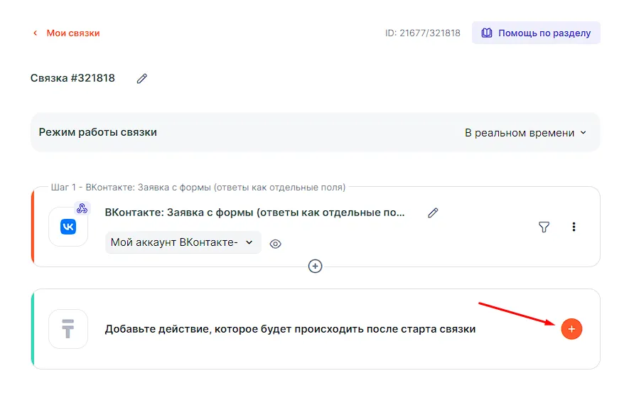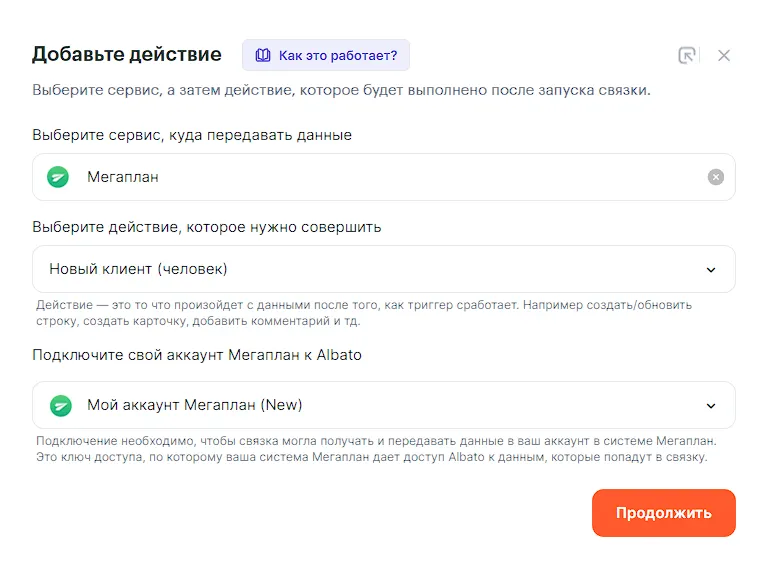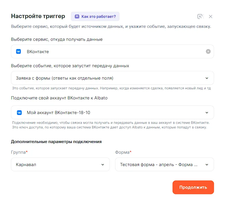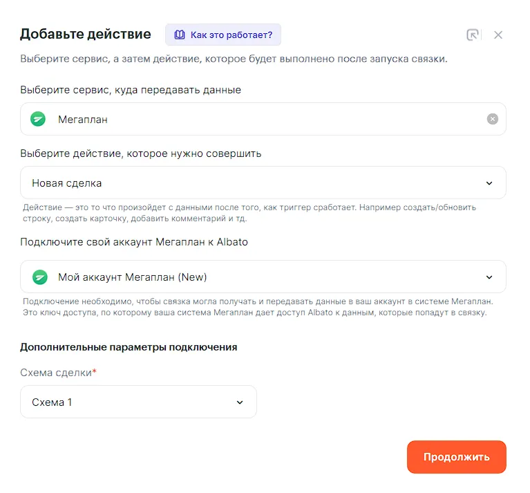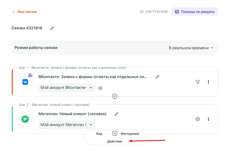 Пример рассматривается с учетом того, что подключение ВКонтакте и подключение Мегаплан к Albato уже готово.
