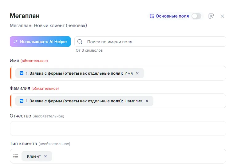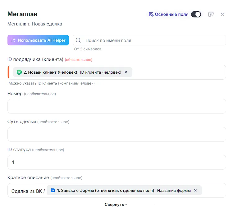 Настраиваем шаг. Заметьте, что поле ID клиента необходимо брать из списка от Мегаплан, чтобы связать клиента со сделкой:
