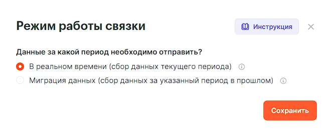 Теперь настроим характер передачи данных. По умолчанию чек стоит в поле для настройки передачи данных в реальном времени. Если ваш тариф позволяет использовать функцию миграции данных, то вы также можете настроить передачу за какой-либо конкретный период в прошлом для полной картины работы сервиса.