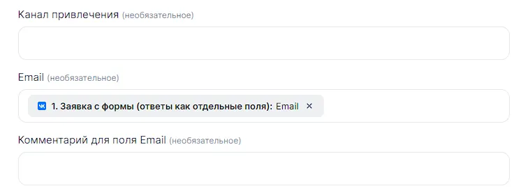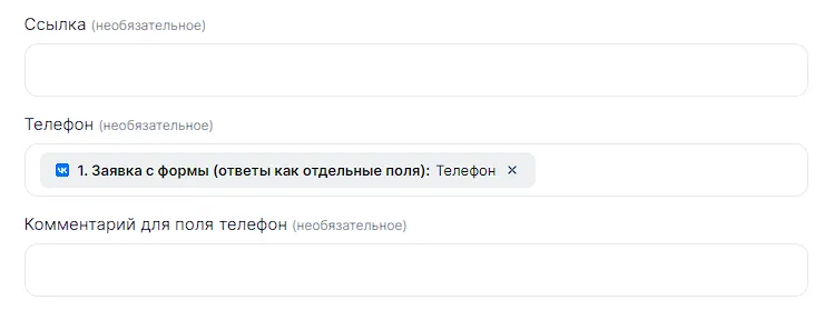 Теперь займемся настройкой полей для передачи. Заполним поля значениями из ВК, как показано на примере: