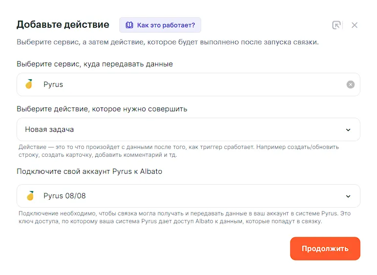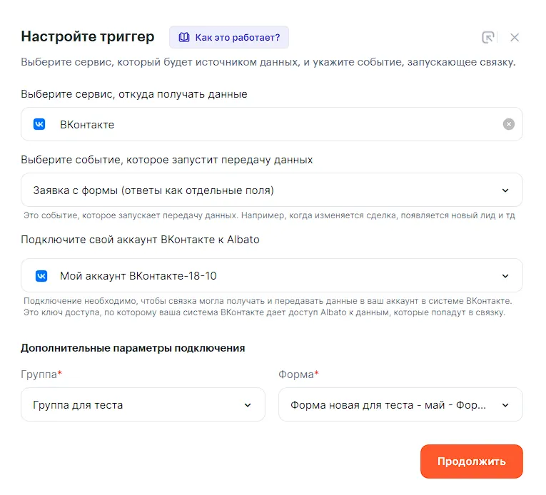 В этой инструкции рассмотрим пример создания связки, которая будет создвать задачу в Pyrus при заполнении формы Вконтакте. Перед созданием связки убедитесь, что оба сервиса подключены к Альбато.